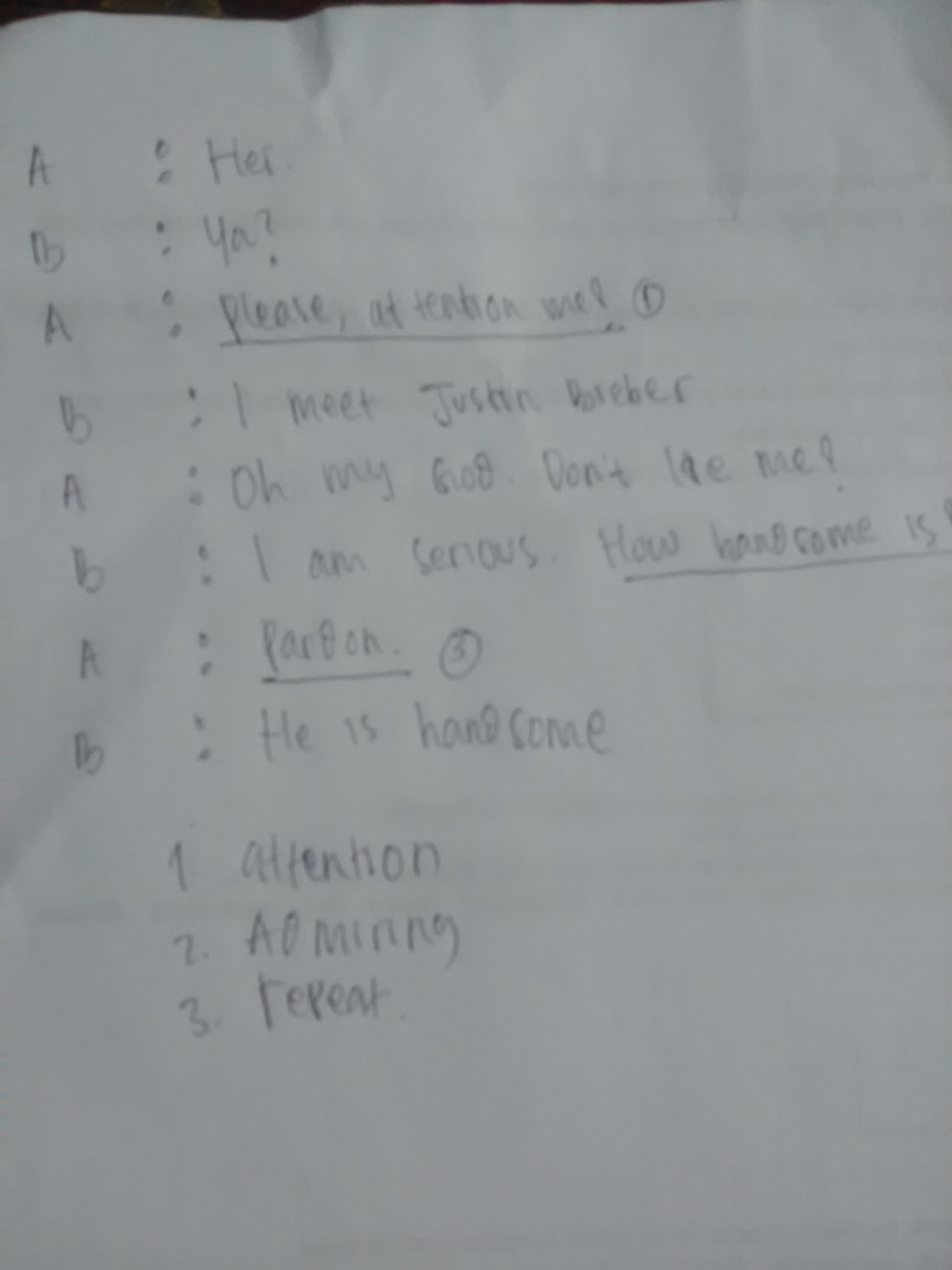 Please don't be noise, attention please! Pada gambar diatas terdapat sebuah percakapan utama antara guru dan siswa/ peserta didik, yang intinya mengenai persetujuan untuk menggunakan bahasa inggris . Daftar pertanyaan untuk biografi seseorang dalam bahasa inggris dan artinya . Hi class, may i have your attention, please? Ungkapan yang digunakan untuk meminta dan merespon perhatian .